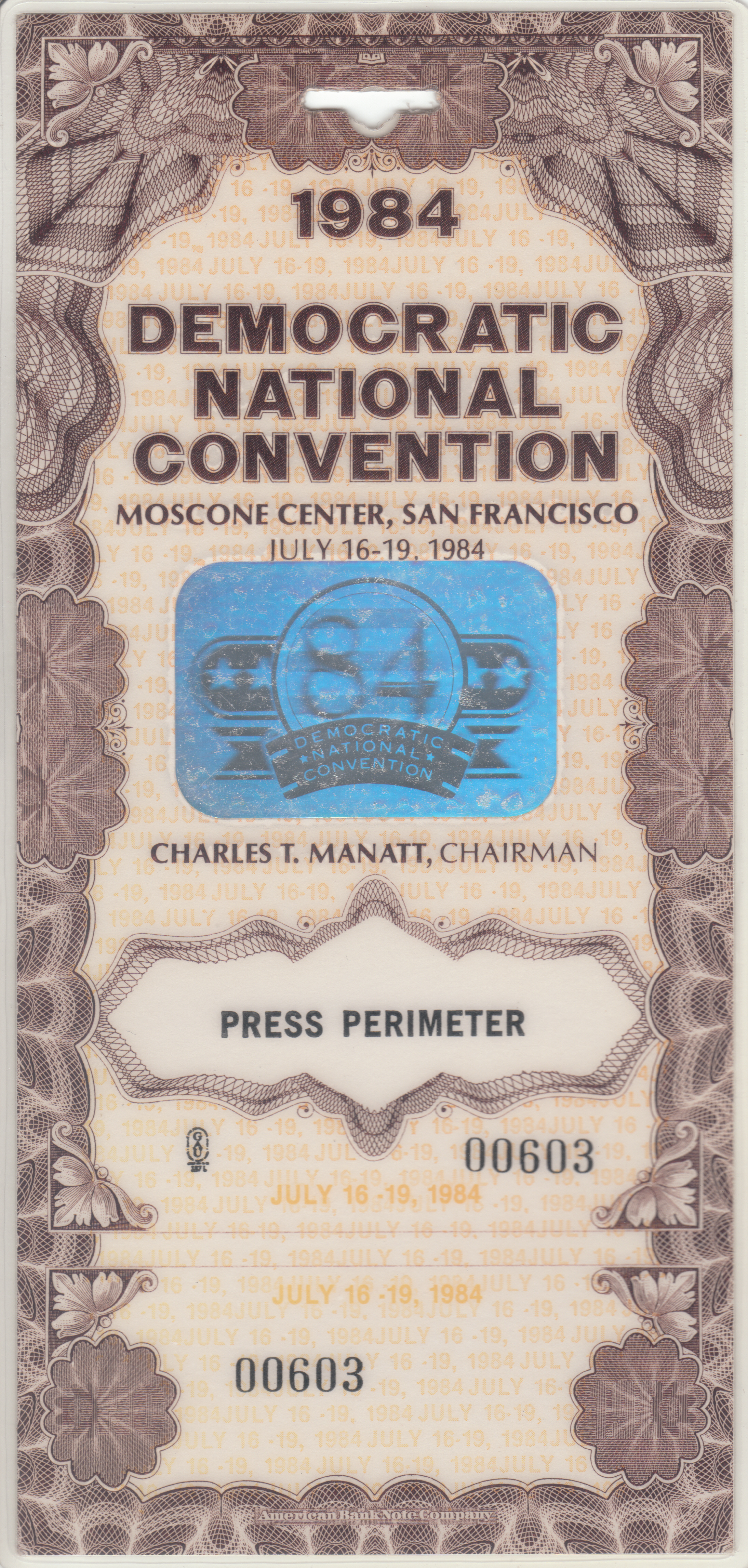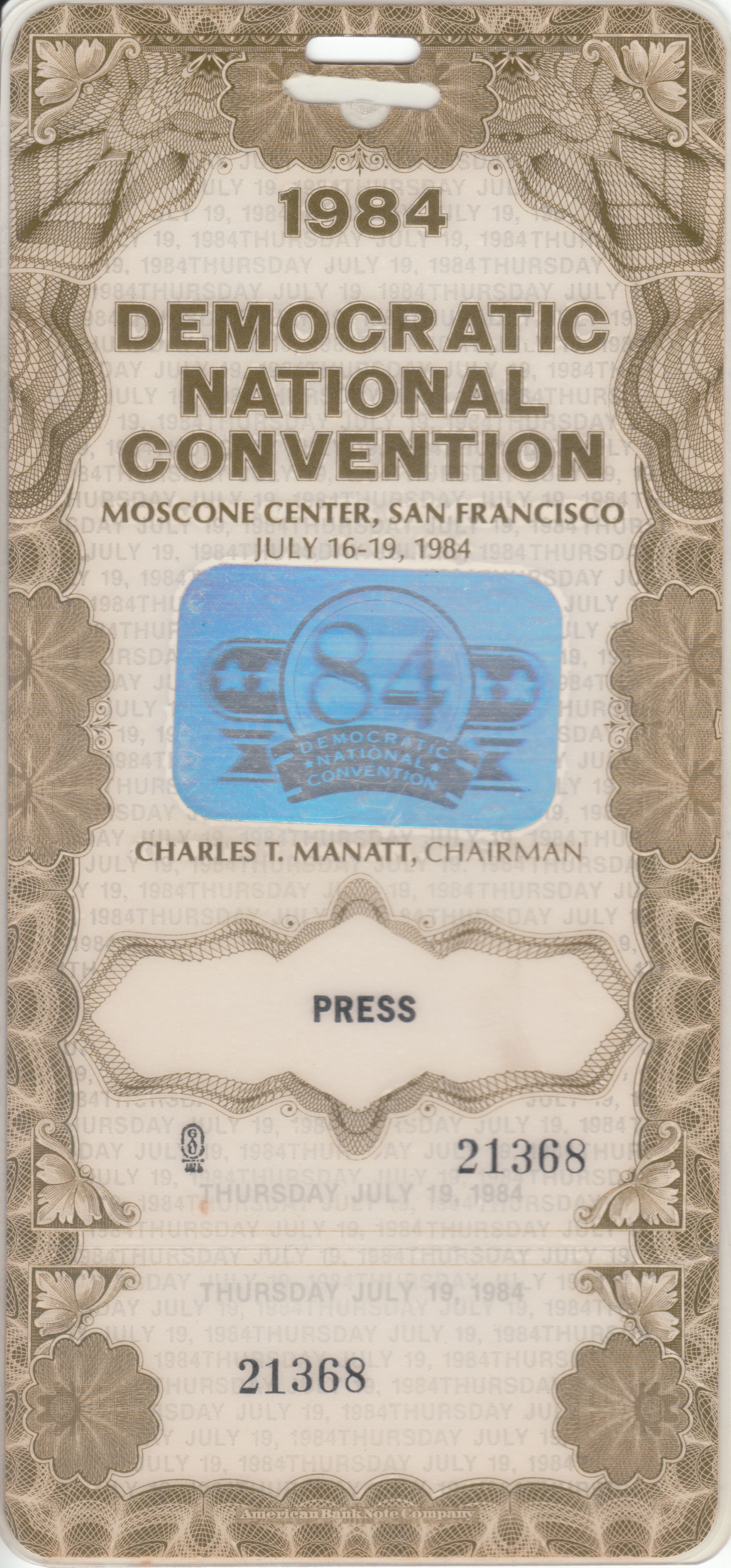 Our 1984 Democratic Convention press credential.