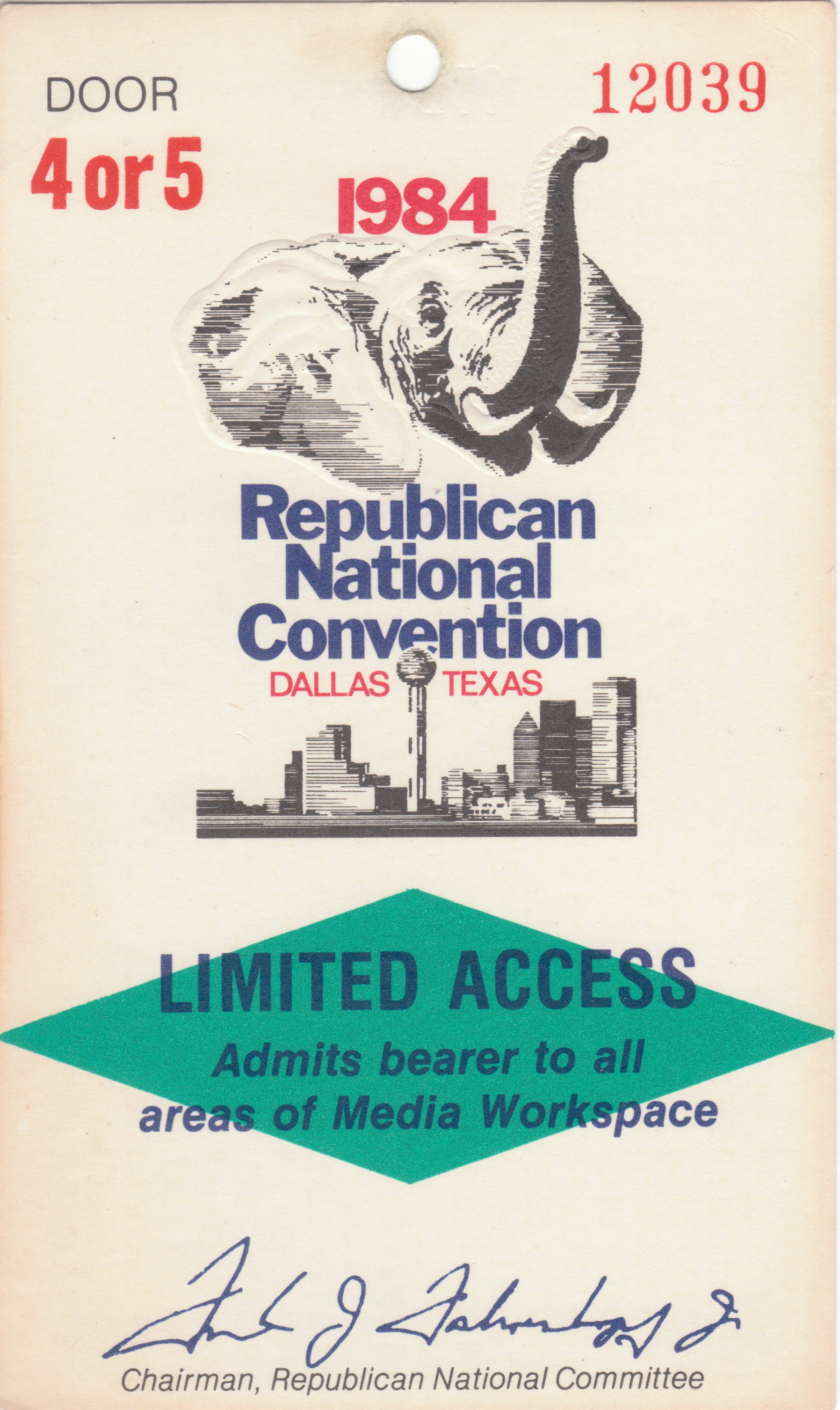 One of the 1984 Republican Convention daily credentials.